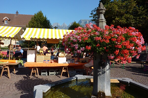 Jeden Freitagvormittag zwischen 08.30 Uhr und 11.00 Uhr sind Gemüse, Früchte, Käse, Blumen und weitere Waren des täglichen Bedarfs im Angebot.
